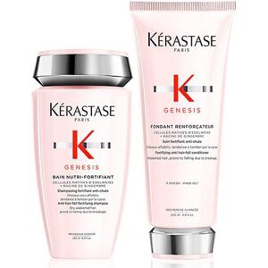 Combat hair fall with this strengthening duo from Kérastase, comprising: Genesis Bain Nutri-Fortifiant 250ml Genesis Masque Reconstituant 200ml Carefully developed with input from expert dermatologists and nutritionists as well as hairdressers, powerhouse Genesis addresses hair fall caused by stress on the hair fibre and hair fall from the mid-lengths due to breakage. The dual-action hair-care collection is specially formulated with soothing ginger root and professional-standard Aminexil to increase fibre strength. The unique Genesis Bain Nutri-Fortifiant frees your hair from impurities while adding resilience to weakend strands. Expect up to 93.3% less hall fall due to breakage. The Genesis Masque Reconstituant is a fortifying, hydrating treatment which helps nourish, detangle and reinforce the hair, reducing the risk of breakage-induced hair fall. Expect up to 99.2% less hair fall due to breakage. A must-have duo for those with dry, weaker hair prone to falling. Ingredients Bain: aqua / water / eau sodium laureth sulfate sodium chloride cocamidopropyl betaine dimethicone citric acid hexylene glycol sodium benzoate sodium hydroxide amodimethicone carbomer guar hydroxypropyltrimonium chloride trideceth-10 glycerin salicylic acid limonene glycol distearate mica peg-100 stearate linalool steareth-6 phenoxyethanol coco-betaine trideceth-3 ci 77891 / titanium dioxide benzyl salicylate coumarin zingiber officinale root extract / ginger root extract citral benzyl alcohol citronellol acetic acid fumaric acid xylitylglucoside anhydroxylitol leontopodium alpinum callus culture extract xylitol xanthan gum dipeptide diaminobutyroyl benzylamide diacetate parfum / fragrance. Masque: aqua / water / eau cetearyl alcohol amodimethicone behentrimonium chloride cetyl esters isopropyl alcohol trideceth-6 phenoxyethanol limonene cetrimonium chloride linalool chlorhexidine dihydrochloride benzyl salicylate coumarin glycerin zingiber officinale root extract / ginger root extract citral benzyl alcohol citronellol xylitylglucoside anhydroxylitol leontopodium alpinum callus culture extract xylitol citric acid xanthan gum dipeptide diaminobutyroyl benzylamide diacetate parfum / fragrance. Gorgeous Shop