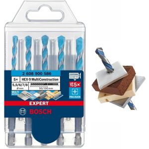 The Bosch EXPERT HEX-9 Multi Construction 5 piece Drill Bit Set is a robust and durable set suitable for working with most kinds of materials. With this set, you can process soft concrete, masonry, brick, cement asbestos, light building materials, multilayer materials, ceramics and tiles, wood, plastic, thin sheet metals and aluminium. The bits are wear-resistant thanks to their diamond-ground cutting edges and carbide blend. The 2-flute U-shape is perfectly suited for effective dust removal, and provides a standard working lifetime. These bits can be used with standard cordless drills and impact drives with 1/4-inch toolholder. Features: Carbide blend with diamond-ground cutting edges Stable drilling in all kinds of materials 2-flute U-shape for good dust removal Bosch Expert Range of Accessories Each EXPERT accessory is backed by an innovative Bosch Technology that ensures it is the best your tool can get. Our new top performance range for all trades Longer, tougher, faster: Up to