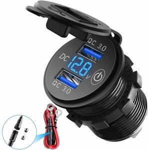 Dual USB QC3.0: The USB charger supports charging 2 devices at the same time, charging is fast and stable, saving time and protecting the safety of the device. . LED Digital Voltmeter: The USB socket can monitor and display the voltage status in real time, and the soft LED ambient light is easy to use and find at night. . Touch Switch: The motorcycle USB charger has a touch switch to save energy and avoid running out of battery when not in use. Wide Compatibility: The charger is suitable for 12/24V cars, motorcycles, ATVs, off-road vehicles, RVs, UTVs, ships, buses, etc. Suitable for charging mobile phones, tablets, GPS, digital cameras, PDAs and other USB accessories. Safety Protection: The USB charger's built-in 10A fuse can prevent overcharging, overheating, overvoltage, short circuit, etc., and improve charging performance with a waterproof cover, effectively extending the service life of the device.