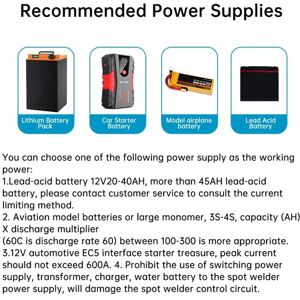 1. 99 gear power adjustable, digital tube real-time display gear 2. Real-time voltage monitoring protection, if the voltage is not in the range of 8-17V, UE is displayed 3. Real-time MOS tube temperature protection. When the MOS tube temperature exceeds 45℃, CE is displayed 4. Using 5 MOS tubes, spot welding current up to 1500A 5. 10AWG wire, alumina copper spot welding needle, high current passing capacity and durability Pure copper conducts heat and improves spot welding efficiency. Product model:Z99 Operating voltage:12V Working current:100-300A Standby power consumption:Less than 0.5ma Thickness of welded nickel sheet:0.1-0.3mm(related to battery ratio) welding current:1500A MAX Voltage requirement:25AH-60AH or high rate battery above 30C Note:Due to different production batches, the colors and styles of accessories are random and cannot be specified. Colour:As Shown Material:ABS Package Contents: 1 set * DIY spot welding machine Only the above package content, other products are