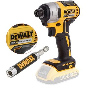 DCF887 Impact Driver Features DeWalt brushless motor delivers more run time over brushed Compact (137mm front to back), lightweight (900 grams) Impact Driver design fits into tight areas Ergonomic comfort grip handle provides ideal balance and tool control One-handed loading 1/4"" hex chuck LED job light Variable speed control trigger Bare Tool - No Batteries or Charger Supplied Dewalt DT7701 80mm Retracting Magnetic Screwdriver Bit Holder This Genuine DT7701 DeWalt Magnetic bit holder / Guide Sleeve for all 1/4 Inch Hex bits, holds screw during positioning. Guide sleeve helps to achieve staraight, accurate screwdriving. Guide sleeve reduces risk of finger injury. Diameter for screwdriving guide is 9.5mm Diameter: 1/4 inch Hex Length: 80mm Extends to 120mm when sleeve is fully extended