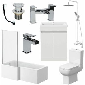 If you're looking to transform your bathroom, this stylish suite from Aquari contains all you will need. The modern square look and top-quality materials and finishes make it one of the most popular ranges on the market. Includes: Space-saving toilet 600mm white gloss bathroom vanity unit 1700mm L-shaped shower bath - left-hand Shower screen Thermostatic mixer shower MDF front bath panel Dakota basin and bath waterfall mixer taps Basin and bath waste pack Features and benefits: Toilet: Manufactured from high-quality white vitreous china A luxury and designer look Short projection model - perfect for space saving WRAS approved dual flush cistern lets you choose between a 3 or 6 litre flush Seat is made from thermoset plastic and has chrome soft closing hinges to reduce noise Dimensions: 350mm (W) x 795mm (H) x 600mm (D) Vanity Unit: Two door vanity unit and single tap hole ceramic basin White gloss finish which is smooth and easy to clean Soft closing doors with stylish groove handles