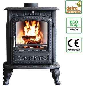 Specification: 2022 Eco Design Ready: Yes DEFRA Approved: Yes Type: Wood-Burning Stove (Wood burning only) Material: Cast Iron Heat output: 6KW Efficiency: 79.8% Efficiency Grade: A Maximum CO emissions: 0.1% Primary air, Secondary air and Tertiary air system External Air Compatible: No Top and rear flue outlet: 5" (125mm) diameter Flue collar included: Yes Colour: Black Glass size: Curved, 306*290mm Overall Size: 676*534*365mm Note: The flue pipe is not included. The P&P is only for those addresses in Mainland England.A surcharge will apply to the remote areas.