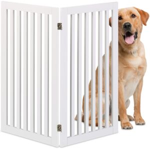 With the free-standing dog guard, you can protect your four-legged friends from stairs and potential danger spots in the home. To keep your dog out of certain rooms, simply set up the dog guard flexibly in the width of your choice. When not in use, it can be folded up at any time and stowed away to save space. The foam protectors also protect the floor from scratches. The simple design blends in perfectly with your home. Dog barrier in detail - Overall dimensions H x W x D: approx. 91.5 x 103 x 2 cm - Maximum width when erected: approx. 96 cm - Bars B: approx. 2.5 cm - Free space between bars H x W: approx. 81.5 x 3.5 cm - Weight: approx. 6.7 kg - Material: MDF - Various colours Free-standing safety gate for dogs - Block off certain rooms or stairs for four-legged friends - Protect dogs from dangerous areas in the home - Animal fence can be flexibly set up in the desired width - Floor protector to prevent scratching of the floor - Can be folded up to save space if required - Simple