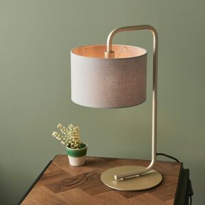 This modern table lamp features a satin champagne finish, complimented by slate grey fabric shade. Strong in form is perfect for contemporary living. FEATURES: * Table lamp * Satin champagne finish * Slate grey fabric shade * Takes 1 lamp * Switched SIZE: * Height: 50 cm * Width: 29 cm * Depth: 23 cm BULB: * Requires 1 x 40 watt max Small Edison Screw Golf Ball (not included) * Compatible with LED lamps