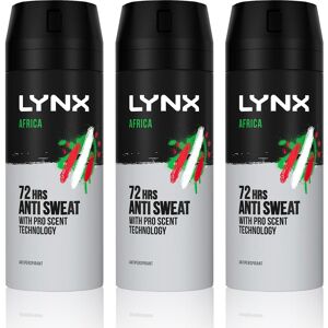 Lynx Body Spray Africa 48-H High Definition Fragrance Deo For Men, 3x150ml Lynx Body Spray is part of the Lynx male grooming range and has been our best selling body spray for over a decade. A few quick sprays are all you need for a lasting, great smelling fragrance that makes a lasting impression. Stay fresh all day with Lynx Body Sprays. This classic fragrance is designed to keep you cool and dry no matter where the heat's coming from. How to use: Shaking the can well and holding it 15 cm away from your chest and body, spray in a well-ventilated area for great protection from style threatening odour. Whatever the occasion, it lasts all day long. Ingredients: Alcohol Denat, Butane, Isobutane, Propane, Parfum, Citronellol, Coumarin, Geraniol, Hexyl Cinnamal, Hydroxyisohexyl 3-Cyclohexene Carboxaldehyde, Linalool Safety Warnings: Avoid direct inhalation. Use in short bursts in well-ventilated places, avoid prolonged spraying. Use only as directed. Keep out of reach of children. Do not spray near eyes. Do not use on broken skin. Stop use if rash or irritations occurs. Do not pierce or burn, even after use. Pressurised container: May burst if heated. Protect from sunlight. Do not expose to temperatures exceeding 50C. Do not spray on an open flame or other ignition sources. Keep away from heat, hot surfaces, sparks, open flames and other ignition sources. Lynx Men's 'Body Spray' Africa High Definition Fragrance Deo, 3x150ml in Green