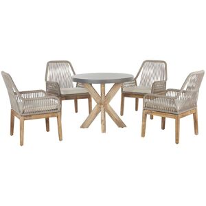 Contemporary Dining Set to Garden. Create a modern and elegant dining area with this garden set. It consists of a round table and 4 chairs in black colour, both of which are made of high quality durable aluminium. The table features wide, geometric legs while the chairs have slatted backrests, a wood-like accent on armrests as well as thickly padded seating cushions. The whole design creates a minimalist yet elegant effect, thanks to which the set will match a variety of outdoor areas, from garden to patio and terrace. Details: Product Type: Dining Set Style: Modern General Color: Black, Grey, Brown Material Type: Synthetic Material Main Material: Aluminium Additional Material: Fabric Material Composition: 100% Polyester Finish: Powder Coated Seat Foam Density: 28 kg/m3 Seats Up To: 4 People Dimensions: Chair Dimensions: 49x54x86 cm Seat Thickness: 5 cm Seat Height: 39 cm Table Dimensions: 110x110x74 cm Overall Dimensions: 110x110x74 Weight: 52 kg Chair Weight Capacity: 160 kg Table
