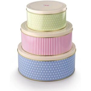 This set of 3 Tala Originals cake tins feature the green polka dots, pink stripes and blue polka dot colours with classic cream lids. The design of the tins are great for storing and transporting delicious home bakes. The three sizes are: Large - 25.5cm(dia), Medium 22cm(dia) and Small 17cm(dia).