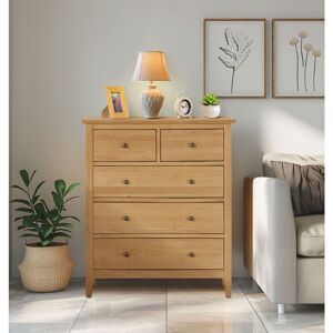 This versatile chest of drawers consists of 5 drawers in total, arranged in three rows, with two smaller drawers above, and three wide drawers below. Ideal for small spaces requiring extra storage, this piece can be used in any room – whilst ideal for bedrooms, consider using this storage unit as a hobby supply organiser, or as an additional storage unit in a living or dining room. Crafted from solid oak and finished with a coating of natural lacquer, this is a durable, long-lasting piece which will be a part of your household for years to come. Suitable for use in any room, this piece is versatile and features a sturdy top surface which can be used as a display area or as additional storage space. Features Finished in a natural lacquer to enhance protection and the wood's natural colouring. Ideal for bedrooms, hallways, and dining rooms. Crafted from solid oak and featuring real oak veneer panels. Features 2 small and 3 large drawers for versatility and additional storage. Assembly: