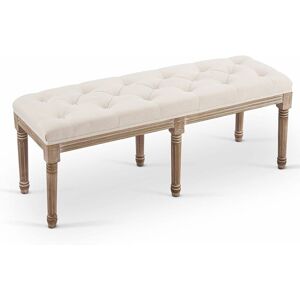 FUNCTIONAL ART: Enjoy all the panache of vintage French furniture with none of the discomfort or worry! This extra-long upholstered bench combines classic Continental style with modern materials and comfort to easily suit any home decor. SUPERIOR QUALITY: Our vintage bench's birch frame and rubberwood legs come with a pleasing weathered finish but are themselves highly durable, boasting a 23-stone (150 kg) weight capacity and family-friendly upholstery. The floor-friendly rubber pads hold but protect any surface. GRACEFUL ACCENTS: The thick foam padding of this 122x42.5 cm bench incorporates diamond tufting, while the solid wooden legs are delicately carved with vintage patterns. HIGHLY VERSATILE: A handsome fit in any space, this multipurpose bench works great in foyers and entryways but is just as suitable as a comfortable piano bench, as a handy bedroom bench, or as extra seating in your dining or living room. ASSEMBLES QUICKLY, LASTS YEARS: Pre-drilled holes beneath the cushion