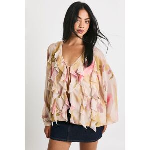 Elegant V-neckline with cascading ruffle detail for a feminine touch Voluminous long sleeves creating a dramatic silhouette Lightweight chiffon fabric offering graceful movement Button-down front closure for versatile styling options Relaxed fit with a slightly cropped length perfect for high-waisted bottoms Make a statement with this eye-catching ruffle chiffon blouse, designed to turn heads on your next night out. The flowing ruffles cascade beautifully across the front, creating dimension and movement that catches the light as you dance. Style with light-wash denim jeans as shown for a chic contrast between casual and dressy elements, or pair with sleek trousers for a more polished evening look. The versatile V-neckline allows for layered jewellery to complement your ensemble. This Boohoo blouse transitions effortlessly from drinks with friends to club nights, offering both comfort and style. The semi-sheer chiffon construction with full lining ensures you feel confident while maintaining that coveted ethereal aesthetic. Add heeled boots and a structured handbag to complete this fashion-forward outfit that's ready for whatever the night brings.