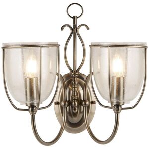 This Silhouette two light wall light is finished in antique brass and comes complete with two clear seeded glass shades.ᅠ The design is beautifully old fashioned and ornate with the upwards facing glass shades creating a lovely lighting effect when illuminated.ᅠ It would make a lovely addition to any room. Product code: 6352-2AB FEATURES: * Finished in antique brass * Clear seeded glass shades * Matching items available (please see website) * Earthed * LED * Pull cord switched SIZE: * Height - 350mm * Width - 340mm * Projection - 200mm BULBS: * Takes 2x 7 watt E14 Small Edison Screw Candle Bulbs - Not included.