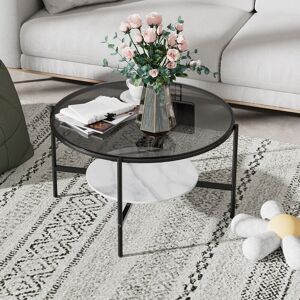 About the coffee table: Add a touch of retro modern design to your living room with the Gloss Round Coffee Table with Tempered Glass Top and Sintered Stone Bottom Shelf. The clean-lined contemporary design of this coffee table features a classic 4 legs with X-cross bottom shelf frame. The top shelf is made of tempered glass and bottom shelf is made of sintered stone, perfect for displaying your favorite magazines or curios. Features: Retro modern design with clean-lined contemporary style Brown tinted or grey tinted finish on the top Bottom shelf made of sintered stone for display Sturdy metal frame available 2 colours: gold and black Dimensions: 18.7 inches high x 31.4 inches diameter Materials: Tempered Glass, Sintered Stone and Metal Table net weight: 38.6 pounds Additional Information: Assembly required This product will ship to you in 1 box Package Included: 1 x Coffee table