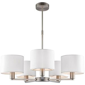 Specification Endon - 5 Light Multi Arm Ceiling Pendant Matt Nickel, Vintage White Silk Effect, E14 Finish: Matt Nickel Plate, Vintage White Faux Silk Material: Steel, Fabric IP Rating: IP20 Height (cm): 65 Diameter (cm): 57 No. of Lights: 5 Lamp Type: E14 Bulb: Candle Dimmable: Yes Description The 5 light pendant is finished in matt nickel with vintage white faux silk shades. This fitting has an adjustable drop, is dimmable and suitable for use with LED lamps. Other ceiling options also available