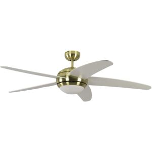 Dimensions and technical details 220-240 V ~ 50 Hz Diameter: 132cm / 52" Housing colour: satin brass Blade colour: white Blade pitch: 12° Lighting: use 1 x R7s base, max. 80 W (bulb not included in the delivery) Motor wattage: 20 / 35 / 60 W Revolutions per minute: 86 / 124 / 175 Max. airflow rate: 159 m³/min / 5615 cfm Max. noise level: 50 dB(A) Ceiling to blades: 26cm / 10.3" Overall drop: 38cm / 15" Max. ceiling slope: 38° Manual reversing switch for summer and winter mode on the housing Includes remote control: 3 fan speeds / off, light on / off Weight: 7.5kg / 16.5lbs