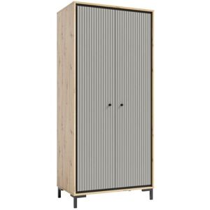 Add a touch of natural elegance to your bedroom with the Parii Hinged Door Wardrobe in Oak Artisan. This wardrobe's warm wood tones and classic black legs provide a sophisticated aesthetic that complements any modern decor. The interior is well-organised with five shelves and a hanging rail, offering ample space for both folded and hanging garments. Constructed from 16mm high-quality laminated board, this wardrobe combines style with durability. Alpen Home Finish: Oak Artisan