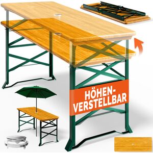 Elevate your garden parties with the Height-Adjustable High Table featuring a Parasol Holder Whether you're hosting a relaxed BBQ or a lively get-together, this table is your perfect partner for memorable gatherings. Its adjustable height feature allows you to seamlessly transition between a bar-style setup and a comfortable dining arrangement, catering to all your social needs Picture this – a sunny afternoon, laughter-filled conversations, and your favourite drink in hand. The beer table's standout feature is its lockable recess (with a diameter of 6cm / 2.4 inches) , designed to hold a parasol securely in place. Enjoy the perfect mix of sun and shade while savouring each moment Foldable , easy to assemble , and designed to impress – this table is your go-to solution for hassle-free entertaining. Crafted with sturdy wood and a robust painted steel frame , it offers exceptional stability. The wood's surfaces and edges are expertly glazed with clear wood varnish , adding an extra