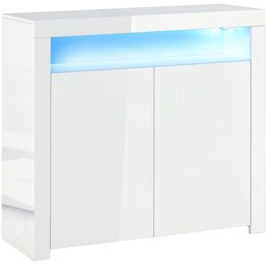 GENERAL DESCRIPTION This HOMCOM cabinet offers a modern solution for indoor storage. It features built-in RGB LED lighting with 16 different modes, an open shelf, and a bottom cabinet with four compartments, providing ample storage space. The high gloss front gives it a contemporary look. TECHNICAL SPECIFICATIONS Colour: White Material: Particleboard Overall Dimensions: 107W x 35D x 97H cm Open Shelf Size: 104W x 32D x 20H cm Storage Compartment Inner Size: 51.2W x 32D x 33.5H cm Weight Capacity: 50 kg (whole), 5 kg (shelf) Item Label: 837-118V70 FEATURES Suitable for home and office use, including lounges and gaming rooms Modern high gloss finish on front panels, easy to clean Built-in RGB LED lighting with remote control Durable particle board structure Anti-tipping straps for wall safety Maximum load of 50 kg, assembly required