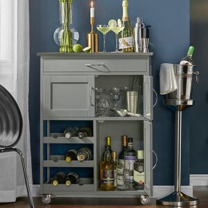 A large, mobile wine cabinet for your home! They have 3 bottle shelves and 1 shelf with doors to store your beloved wine. A variety of beautiful glasses can be stored on the middle shelf. The small drawers are specially designed for small items such as bottle openers. Thanks to the 4 castors (two with stoppers), our kitchen trolley quickly and safely transports food and drinks to their desired location. The work surface offers plenty of space for storing and preparing meals. This is easy to clean and contributes to the high-quality appearance. The base is panels and ensures high stability. This light gray trolley with stainless steel plate stands out and emphasizes the exclusivity of the kitchen trolley. No matter where you want to use it, it looks great in any room. Marlow Home Co. Base Finish: Grey/Silver, Counter Material: Stainless steel