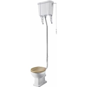 Echoing a classic design the traditional Milano Richmond close coupled toilet with high level cistern and chrome flush pipe will give your bathroom a touch of added elegance. Combining smooth curves and soft lines the premium quality ceramic toilet has an easy to clean white glaze to ensure long-lasting durability. The high level cistern which connects to the pan with a chrome flush pipe is accentuated by a chain flush mechanism with an ergonomic ceramic handle. The timeless style is completed by the white finished engineered wood seat. - Premium quality ceramic construction with hard-wearing white glazed enamel - Traditional design to create a classic look in your bathroom - Includes a chrome flush pipe and high level cistern with ceramic handled chain flush - Moisture resistant engineered wood seat with white finish - Includes a pan fixing kit to aid installation - This product is covered for 20 years - Dimensions: 472mm x 625mm x 2140mm Please note: You will need a pan connector.