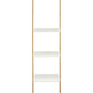 Simple, unfussy lines hallmark the Nostra shelf ladder unit. Its frame is made from sustainable bamboo wood, flattened at the top to keep it secure when leaned against the wall. Three white shelves create a tonal counterpoint to the golden wood, with open fronts that provide an unimpeded view of whatever is being displayed.