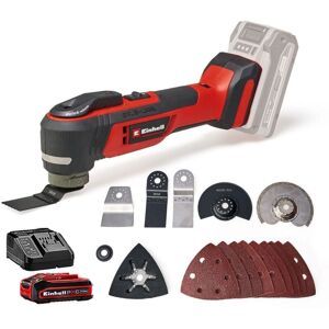 The Einhell TP-MG 18 Li BL-Solo Power X-Change Multifunctional Tool is a versatile and high-quality device for construction and renovation work. Thanks to its extensive equipment, tasks such as sawing, sanding or scraping can be carried out effortlessly. Powered by a Einhell PurePOWER brushless motor. This brushless motor offers more power and a longer running time than conventional carbon brush motors. Once you register online, the brushless motor has a 10-year warranty. Speed electronics ensure precise and material-friendly working. The multitool works with an oscillation angle of 3.2°, which enables precise use. A switch with locking function facilitates time-intensive work. The innovative, vibration-decoupled device head enables vibration-free application. Whilst softgrip surfaces ensure safe and comfortable working. The tool-free accessory change is made possible by the quick-release lock. Thanks to the magnetic tool adapter, accessories can be changed quickly and easily. The