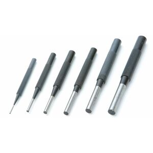 A hardened and tempered parallel pin punch used for removing pins in parallel holes. The pin should be first started with a hand or taper punch to avoid damage to the point of the parallel punch. Walleted set of 6 containing one of each of the following sizes. 1/16, 1/8, 3/16, 1/4, 5/16, and 3/8in.