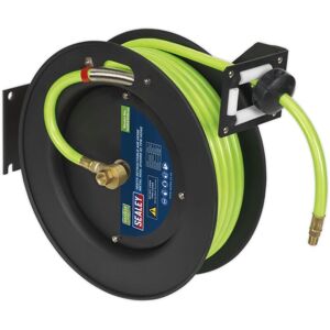 Steel construction with corrosion resistant powder coated finish. High visibility TPR air hose for added safety around the workshop. 9-Position guide arm with four non-snag rollers. Multi-position ratchet lock. L-Shaped bracket enables the unit to be wall, floor or ceiling mounted. Features & Benefits: • Steel construction with corrosion resistant powder coated finish. • 9-Position guide arm with four non-snag rollers. • Multi-position ratchet lock. • L-Shaped bracket enables the unit to be wall, floor or ceiling mounted. • High-visibility TPR hose for added safety around the workshop. • Model No. SA841HV Specifications: Model No SA841HV Brand: Sealey Hose Size (ID/OD): Ø10/17mm Hose Type: TPR (PVC Outer) Inlet Size: 3/8"BSP Length: 15m Maximum Pressure: 300psi Nett Weight: 14.88kg Optional Accessories: Swivel Mounted Plate - SA85SP Outlet Size: 1/4"BSP