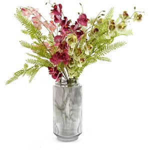 These artificial flower arrangements come with the vases � a complete pack of everything you need to create the display shown in our photos. When arranged as we have it shown in our photos this measures 65cm x 55cm x 55cm. Stems are wired and this can be shaped to your requirements. This pack contains the following: 1 x LEAF-40577 31cm clear ridged glass vase 31cm tall x 15cm x 15cm at widest points and the slightly narrower top rim measures 11cm diameter. 3 x LEAF-40671 80cm cream artificial mini orchid stem with ten flowers. 3 x LEAF-40672 80cm dark pink artificial mini orchid stem with ten flowers. 3 x LEAF-40673 80cm pink artificial mini orchid stem with ten flowers. 2 x LEAF-40696 95cm artificial Himalayan maidenhair fern stem. Flowers and foliage are supplied loose at full length ready for you arrange. You can cut these shorter if wanted for arrangement (very easy- just use wire cutters) or you can just fold the stems at the ends before putting them in the vase Leaf