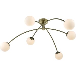 This Dar Puglia six light semi flush ceiling light is finished in antique brass and comes complete with opal glass shades.ᅠ The curved arms have a beautiful appearance.ᅠ Cleverly designed this light is based on a single curve with three arms.ᅠ It would make a wonderful addition to any room. Product code: PUG6475 FEATURES: * Finished in antique brass * Comes complete with opal glass shades * Suitable for low ceilings * Dimmable * Earthed SIZE: * Height - 380mm * Diameter - 900mm BULBS: * Takes 6x 20 watt G9 Halogen Bulbs - Not included * Also suitable for use with LED bulbs.