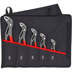 00 19 55 S8 KNIPEX Cobra® Set The KNIPEX Cobra® are the legendary high-tech water pump pliers from KNIPEX. With their extremely strong self-locking effect, they allow energy-saving work without slipping on the workpiece. High-quality tool roll made from durable polyester fabric with hook-and-loop fastener. These sets each contain three high-tech water pump pliers of different sizes with slim, plastic-coated handles. Dimensions, open (L x H): 430 x 325 mm. Content: 1 x 87 01 125 KNIPEX Cobra® High-Tech Water Pump Pliers (125 mm), 1 x 87 01 180 Knipex Cobra® High-Tech Water Pump Pliers (180 mm), 1 x 87 01 250 Knipex Cobra® High-Tech Water Pump Pliers (250 mm),