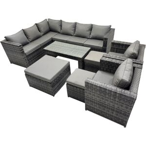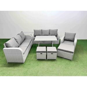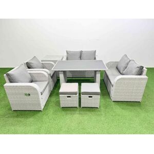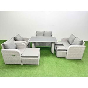 Luxury PE Rattan Sofa Set - Premium Outdoor Furniture for Patio & Garden Transform your outdoor space into a stylish oasis with this deluxe PE rattan sofa set expertly crafted for durability, comfort, and timeless elegance. Perfect for hosting guests or unwinding under the sun! Premium Quality Construction All-Weather PE Rattan: UV-resistant, non-fading woven wicker withstands sun, rain, and temperature changes. Rust-Proof Galvanized Steel Frame: Powder-coated for enhanced corrosion resistance and long-term stability. Industrial-Grade Weight Capacity: Sofas support up to 250kg, tables hold 80kg built for reliability. Ergonomic Comfort Features 2 Adjustable Reclining Armchairs: Customize your relaxation with 90-130 backrest angles (easy-button adjustment). Ultra-Plush Cushions: 8cm thick seat cushions + soft backrests with removable, machine-washable covers (dark grey premium fabric). 5mm Tempered Glass Tabletop: Anti-slip suction pads ensure safety; scratch-resistant surface. Set dimensions: 1 x Recliner: 74W x 69D x 79H cm 2 x Love Sofa Size: 124W x 67D x 79H cm 2 x Fully Assembled Stools :40W x 40D x 34H cm 1 x Oversized Footstool: 65L x 65W x 34H cm 1 x Side Table: 65L x 65W x 66H cm 1 x Dining Table: 110L x 70W x 70H cm Hassle-Free Assembly & Maintenance Flat-Pack Delivery: Easy-to-follow instructions with numbered parts. Low Maintenance: Wipe rattan with damp cloth; store cushions indoors or use included rain covers during off-seasons. Modular Design: Rearrange components effortlessly to suit your space. Important Notes Color: Light grey rattan + dark grey fabric (minor monitor color variations possible contact us for fabric samples). Delivery: Curbside drop-off only; inspect packages before signing. Report damages immediately for free replacements. Weather Protection: Use provided rain covers for long-term outdoor storage.