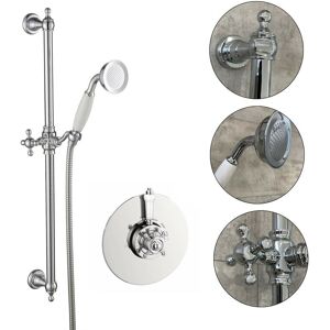 This traditional thermostatic shower valve kit is made from solid durable brass in a chrome finish with ceramic materials to give that classical effect. The solid brass riser rail comes with a 200mm brass shower head. The shower kit is complete with a traditional exposed valve which operates a single outlet. The valve comes with a ceramic lever which controls the water flow and the water on/off for the main shower head and the cross handle in the middle of the valve provides ease of use and allows you to control the temperature.