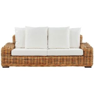 Boho Outdoor Sofa. Refresh your surroundings with this Boho-inspired sofa in a natural colour. Made from rattan, the piece is durable and adds a vintage elegance to any living space. Equipped with thick and comfortable seat cushions, the 3-seater is a perfect spot for afternoon tea or gatherings with friends and family. Introduce timeless charm to your patio with this easy-to-maintain, functional and decorative sofa. Details: Product Type: Garden Sofa Style: Boho General Color: Natural, White Material Type: Rattan Main Material: Rattan Additional Material: Cotton Seats Up To: 3 People Dimensions: Depth: 75 cm Seat Height: 35 cm Width: 202 cm Height: 82 cm Seating Surface: 56x170 cm Weight: 25 kg Weight Capacity per Person: 100 kg Offer Includes: 1 x 3 Seater Sofa, 1 x Seat Cushion Key Features: Great Relaxation Spot, Modern Patio and Garden Style, High-Quality Materials, Unique Handmade Piece, Removable Cushion Cases Assembly Information: Does Not Require Assembly Additional