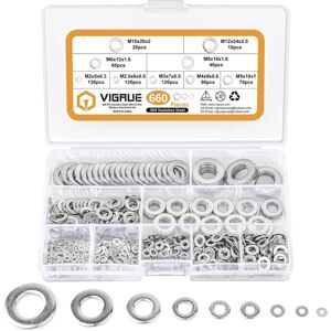 【Easy to find】 M2 130pcs, M2.5 120pcs, M3 120pcs, M4 90pcs, M5 70pcs, M6 60pcs, M8 40pcs, M10 20pcs, M12 10. Were arranged in a transparent storage box , easy to find. 【High-quality materials】 Washers made of high-quality 304 stainless steel, corrosion resistance, good toughness, abrasion resistance and low temperature resistance, the material is sturdy and durable.< br>【Various Sizes】 9 sizes are available M2 M2.5 M3 M4 M5 M6 M8 M10 M12. Different sizes of flat washers can meet your different needs. 【A lot of choices】Here you can choose different diameters and thicknesses for different requirements. 【Used in different areas】Washers are used to protect the contact surface against damage caused by friction (scratching) and to transfer the forces from the nut to the contact surface in the event of larger than intended holes.Suitable for electrical connections to household appliances, industrial installations, automobiles , shipbuilding, etc.