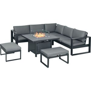 Relaxing evening times need never be cold again - do it in all with this Outsunny outdoor aluminium garden sofas set, with fire pit table. The two loveseats, corner seat and two footstools mean there's room for your favourites to gather round, with the table giving you somewhere to eat and drink from. In the middle of the table, there's a fire pit: provides up to 50,000 BTU power - plenty of heat for the colder climes. There's a wind guard for the fire, so you can keep peace of mind, at all times. Specifications: ● Colour: Grey ● Material: Aluminium, Polyester, Tempered Glass, Stainless Steel ● Loveseat Size: 153W x 85D x 78Hcm ● Seat Size: 142W x 65Dcm ● Single Corner Sofa Size: 85W x 85D x 78Hcm ● Seat Size:65W x 65Dcm ● Footstool Size:75W x 50D x 33Hcm ● Seat to Floor Height: 33cm ● Table Size: 105W x 105D x 64Hcm ● Heat Power: 50,000 BTU;● Fits for 11kg liquefied natural gas tank (NOT INCLUED) ● 1 AAA Battery Required but NOT INCLUDED ● Weight Capacity: 120kg(Single Corner