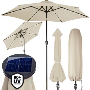 Sun protection during the day and light in the evening! The KINGSLEEVE Miami parasol with UV protection 80+ can be opened and closed quickly thanks to the smooth crank function and offers optimal protection from the sun . The robust mast is made of lightweight aluminium and can be broken down into 2 parts for easy storage. The matching protective cover is included , so the umbrella remains perfectly protected even when not in use. The 24 LED lamps provide a pleasant ambience with their atmospheric light. Electricity is provided by a powerful solar panel that is attached directly to the top of the umbrella. The light can be controlled via a small and inconspicuous on/off toggle switch on the umbrella pole. The umbrella covering is made of water-repellent fabric . The umbrella can also be tilted for optimal shadow casting . Product Details: - 24 LED lights with on/off toggle switch on the umbrella pole - UV protection 80+ - Including umbrella cover - Powerful solar panel - Rustproof