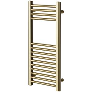 Model Number: WDB14150 Introducing the Colore Brushed Brass 800mm x 400mm Straight Heated Towel Rail, a compact and stunning straight towel heater that effortlessly complements any bathroom or interior style. Its rectangular and boxy design, measuring 800mm x 400mm, ensures maximum convenience while providing consistent warmth and toasty towels to wrap yourself in every morning. And with the handy brackets included, wall-mounting installation is a breeze. Invest in this exquisite brushed brass heated towel heater today and enjoy the peace of mind that comes with a 5-year guarantee. Key features Stunning brushed brass finish Made from durable steel material Complete with wall mounting brackets Vertical orientation Connects to the central heating system for easy installation Ample towel hanging space Product Notes: Radiator valves are not included but can be purchased separately. We advise against installing pipework until you have received the heated towel rail. Remember to consider