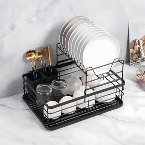Description: This space-saving dish drainer rack keeps your kitchen organised and running efficiently. Made from high-quality iron with a black-coated finish, it offers a sturdy structure with excellent weight-bearing capacity, making it easy to store all your kitchenware. Its thoughtful design promotes better air circulation and features a removable drip tray to collect excess water, helping to keep your countertops clean and dry. It combines practicality with modern aesthetics, making washing and drying dishes easy and suitable for any kitchen style. Features: *The detachable 2-tier design can accommodate multiple bowls or plates while saving counter space. *Open design allows for quick drying and easy access to dishes. *You can easily assemble the drainer rack without screws or tools. Specifications: Overall Dimensions: 43cm(W) x 32cm(D) x 27cm(H) Product Type: Drainer Rack Material: Iron + Plastic Colour: Black Assembly Required: Yes Package Content: 1 x Dish Drainer Rack Package