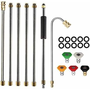 Sturdy & Leak-Proof: These pressure washer wands are made of durable stainless steel and feature brass fittings for superior rust and leak-proof performance, and can withstand pressures up to 4,000 psi . The working temperature can be as high as 60℃ and the service life is long. Package Contents: Gutter cleaning tools include 6 straight wands (15" each) + 1 stem 120 degrees + 10 O-rings + 5 nozzle tips. This Universal Replacement Adjustable Pressure Washer Extension Lance. You can adjust the total length of the pressure washer wand freely according to your needs. Quick Connect Swivel Fitting: 270 degree adjustable roof cleaning wand for cleaning angles, 1/4" plug inlet and 6.35mm quick socket outlet, easy to attach between nozzle and wand. It helps you save time to clean hard-to-reach areas and reach car chassis and car rims, ideal for gutter cleaning. 5 Color Nozzle Heads: The Cleaning Lance Nozzle Includes six 1/4" nozzle heads with different spray angles (0 degree/15 degree/25
