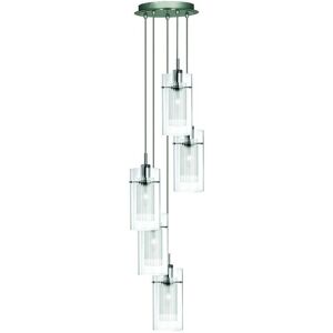 Specification Searchlight Duo 1 - 5 Light Spiral Cluster Pendant Chrome, Glass, E14 Finish: Chrome IP Rating: IP20 Height (cm): 120 Diameter (cm): 13 No. of Lights: 5 Lamp Type: E14 Dimmable: Yes Wattage (max): 60 Weight (kg): 3.6 Class: 1 (Earthed) Bulb Included: No Description The Duo range offers a choice of different fittings which allow you to match up light fittings. Whatever the size and shape of your room, you are sure to find the perfect fitting in this collection. The double glass of the shade includes both frosted and clear glass, giving the fitting an extra dimension and adding to the decor of the room. This five light pendant is also available as single and three light options, a three light on a bar, and a wall light . All fittings are also available with smoked glass.