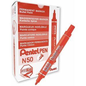 Inside the chunky aluminium barrel of each Pentel N50 permanent marker is quality Pentel indelible ink that writes smoothly on almost any surface, from plastic and metal, to ceramics and glass. The bullet tip writes a 1.5 to 2.0mm line width, which is ideal for general purpose use in industry or commerce. This pack contains 12 red markers.