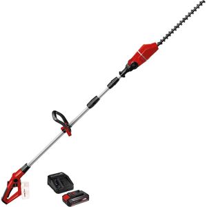 Part of the Power X Change 18v system, the Einhell GE-HH 18/45 Li T is a cordless long reach hedge trimmer which shares battery compatibility with a wide variety of tools for the home and garden. Ideal for maintaining tall and broad hedges as well as shrubs and ground covering plants, it has a telescopic shaft and the head and rear handle can both be adjusted to suit a multitude of working angles. Battery operation means you can take the GE-HH 18/45 Li T just about anywhere, without the noise and fumes of petrol, and without having to safely store and transport fuel. It has metal gearing designed for longevity, and laser cut, diamond ground blades for clean cutting results Specifications: • Blade Length: 450 mm • Tooth Spacing: 16 mm • Cuts per minute: 1700 min^-1 Features & Benefits • Cordless pole hedge trimmer for long reach • Compatible with all Power X Change 18v batteries • Suitable for tall hedges and ground covering plants • Main handle tiltable with 4 settings • Motor head tiltable with 7 settings • Telescopic aluminium shaft • Additional adjustable handle with quick fastener • Metal gearing for a long life • Laser cut and diamond ground blade • Sturdy cutter guard for storage and transportation • Includes shoulder strap Contents • GE-HH 18/45 Li T Solo Power X Change Hedge Trimmer • Shoulder Strap • Blade Sheath • Einhell 18v Power X-Change Li-Ion Battery 2.5ah (x2) • Battery Charger