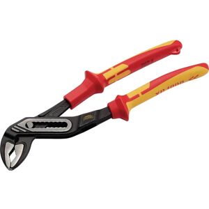 Expert quality XP1000®, Manufactured from premium steel. Induction-hardened jaws provide better gripping performance, featuring multi-position adjustment and 'no-nip' handles. A two-part bi-material ergonomic soft grip handle allows maximum grip and user comfort, and horns prevent slipping onto live conductors. Tested to 10,000V, these pliers are suitable for working on live circuits of 1,000V AC and 1,500V DC. The handle also incorporates a tethered fixing solution to comply with Work at Height Regulations (lanyard Stock No. 82474 and wrist strap Stock No. 03740 sold separately). Maximum cutting capacity: 1.8mm. Manufactured and individually certified to EN 60900 Features and Benefits • Draper Expert XP1000® quality • Certified for use on live circuits of 1,000V AC and 1,500V DC • Tethered fixing solution complies with Work at Height Regulations • Easy and comfortable to use with soft grip handle • Multi position joint and 'no-nip' feature • Lifetime Warranty Specifications Handle Type: Tethered Length: 250mm Cutting Capacity: 1.8mm Insulation: VDE Insulation Testing: Tested to 10,000V, suitable for working on live circuits of 1,000V AC and 1,500V DC Contents 1 x XP1000 VDE Water Pump Pliers, 250mm, Tethered