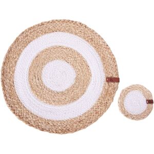 Set of Round Handmade Placemats and Coasters. Infuse your dining space with a burst of colour and natural elegance with this exquisite set of placemats and coasters. Crafted from a blend of jute and cotton, the vibrant fabric centre surrounded by warm, earthy jute creates a stylish contrast that enhances any table setting. Handwoven with care, these eco-friendly pieces offer both practicality and beauty, protecting your surfaces while adding a unique, chic touch to your home. Perfect for any occasion, this set combines modern design with sustainable craftsmanship for a truly stunning dining experience. Details: Product Type: Placemats and Coasters Style: Boho General Color: Natural, Grey Material Type: Wicker Main Material: Jute Shape: Round Handmade: Yes Dimensions: Depth: 35/10 cm Width: 35/10 cm Height: 0.8 cm Weight: 0.2 kg Offer Includes: 6 x Placemat, 6 x Coaster Key Features: Hand-Crafted with High Attention to Detail, Decorative Yet Functional, Blends Well with Any Decor, For