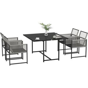 GENERAL DESCRIPTION The Outsunny outdoor dining table and chairs set is made of durable steel and features a matching table. This metal garden furniture is perfect for outdoor relaxation and can be easily stored by folding the chairs under the table when not in use. TECHNICAL SPECIFICATIONS Colour: Light Grey Material: Steel, Tempered Glass, Texteline Table dimensions: 120L x 120W x 72H cm Chair dimensions: 53W x 62D x 82H cm Seat dimensions: 48W x 43D x 40H cm Armrest dimensions: 1.8W x 55D x 65H cm Backrest dimensions: 46L x 46W cm Weight capacity: 130 kg (chair), 50 kg (table) Item label: 84G-252V00LG FEATURES Includes four chairs and a matching table 5 mm tempered glass tabletop Strong powder-coated steel frames Breathable texteline seats that dry quickly Assembly required