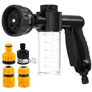 8-In-1 Sprayer Mode: This dog wash hose attachment features 8 spray patterns, you can rotate the sprinkle head and switch the spray pattern - Shower, Cone, Flood, Full, Flat, Center, Jet, Mist, to meet your various cleaning needs Strong Applicability: The pet shower attachment is equipped with 4 universal faucet connectors, it can be assembled with a variety of different water pipes and faucets, suitable for different strengths of water pressure. Quality Material: The cleaning water gun is made of high-quality plastic and ABS, enduring for a long time use. The soap on/off would help you to switch the soap mode and water mode, and control the dilution of foam. Easier and Comfortable: No need to keep squeezing the trigger during the use of the pet shower sprayer, just press it to start working and press it again to turn it off, which makes cleaning your pet easier and more comfortable. Wide Use: Whether you want to wash the hard floor, or bathe the dog with a soft shower nozzle, the