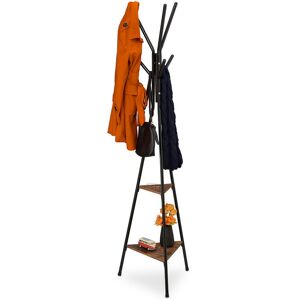 This modern coat rack offers enough space for jackets, coats, scarves, bags and other items of clothing with a total of 6 hooks. Keys, caps, decorations and other accessories can be stored on the 2 shelves. The free-standing coat rack with stable tripod frame can be placed as desired in the office, hallway or bedroom. There, the coat rack convinces especially with its industrial mix of black metal and brown wood optics. Coat rack in detail - Overall dimensions H x W x D: approx. 181.5 x 50 x 43 cm - Weight: approx. 3 kg - Material: Iron, MDF, plastic - Colour: Black, brown Coat rack in industrial design - Dimensions large shelf W x D: approx. 37 x 33 cm - Dimensions of small shelf W x D: approx. 21 x 19.5 cm - Diameter of hooks: approx. 1.9 cm - Height of hooks: approx. 149 and 181.5 cm - Max. load: approx. 25 kg Free-standing coat rack for the entrance area - For more order in the hallway, office, bedroom etc. - 6 hooks for jackets, coats, hats, bags etc. - Free-standing tripod frame