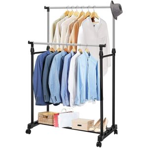 Description: With stoppers on the end of the rails preventing items from slipping off & wheels on the bottom for easy movement these rails are finished in a mixture of black & silver metal & plastic Height can be altered easily Offers a phenomenal value with swivel casters and easy assembly It can be adjusted in height, suitable for any room storey Comes with wheels for easy movement Free Standing Quick assembly - no tools required. Bottom rack for additional storage?With Shoe Shelf Material:PP Plastic Connector, Iron Pipe Plastic Spray, Stainless Steel Pipe Main Colour:Sliver Size:Height 90- 165cm x Width 85cm x Depth 42cm Height:90-165cm Max Load:15kg Package Included: 1 x Clothes Rail
