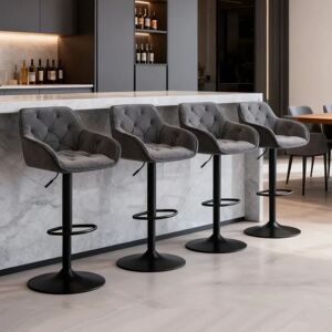 Whether at home or at work, this bar chair can provide you with comfortable, fashionable and practical seating solutions. Don't hesitate to buy it immediately and get a perfect bar chair to improve your quality of life! Feature: -This bar chair is unique in design, equipped with armrests and backrest. The seat is made of velvet, and the cushion thickness reaches 7cm, so as to ensure that you can enjoy the greatest comfort when using it. -The bar chair seat can rotate freely in 360 degrees, allowing you to rotate easily and reach the required position without leaving the chair. -The height of the chair can be easily adjusted to meet the needs of different people and ensure your comfort and work efficiency. -We offer a variety of color choices, so that you can choose the most suitable color according to your personal preferences and home decoration. -This bar chair is not only suitable for family use, but also for offices, bars, restaurants and other occasions to meet your different